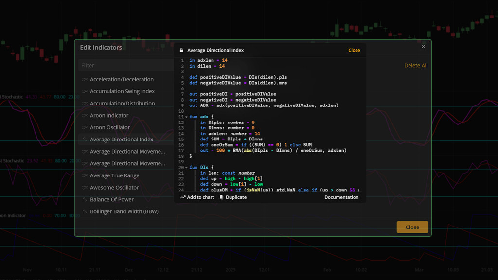 DXcharts also allows you to create custom indicators through our proprietary language – dxScript. This domain-specific language is used to transform one data series into another. Designed for traders with no programming experience, dxScript has a clear and simple structure that allows traders to easily understand the scripts they create. In addition, the language comes with documentation that makes the process of creating indicators easier and more straightforward.