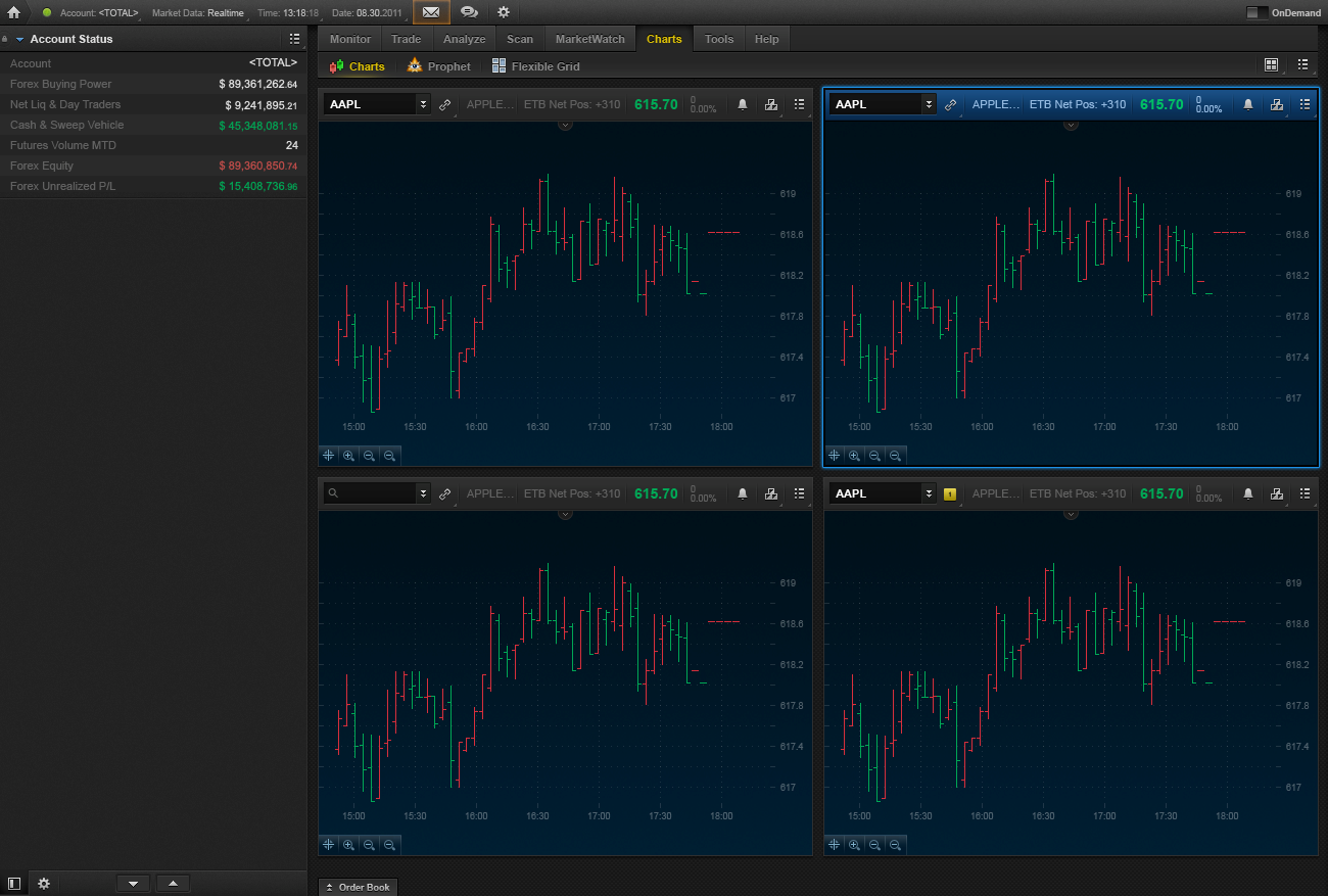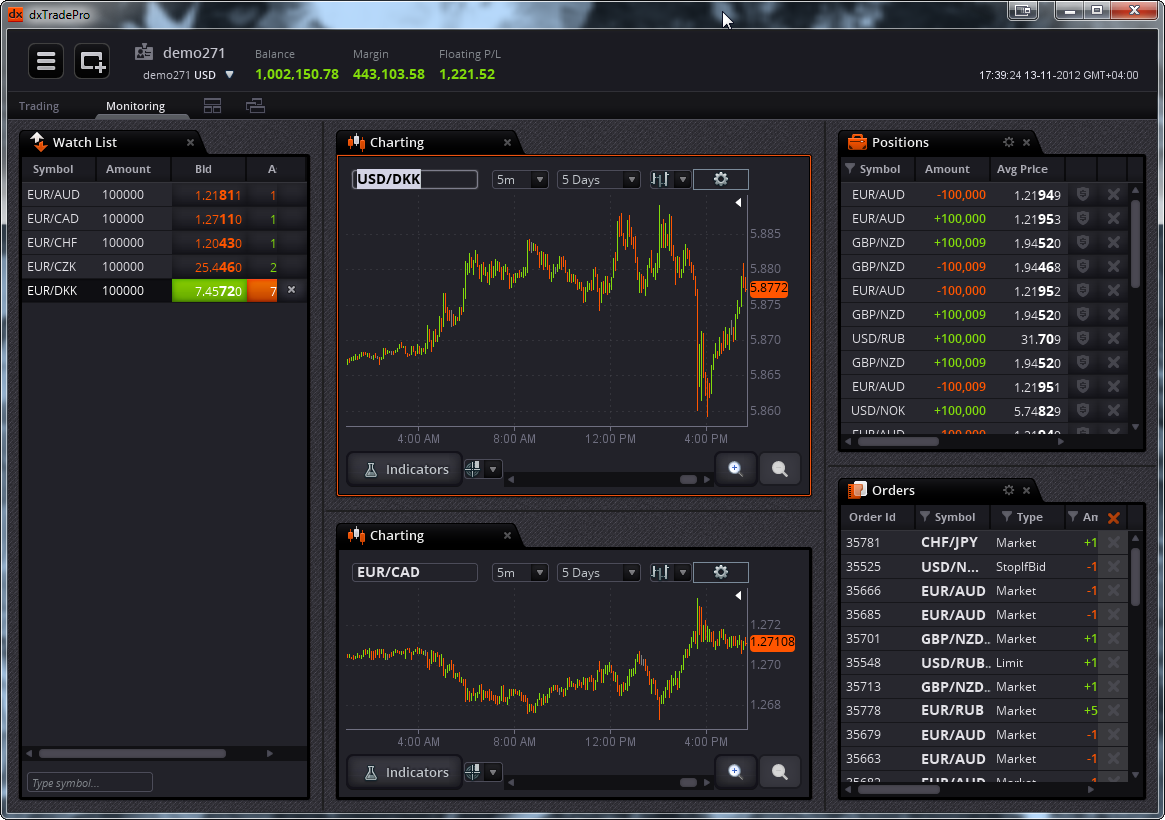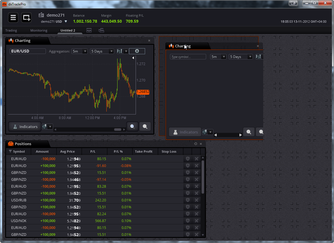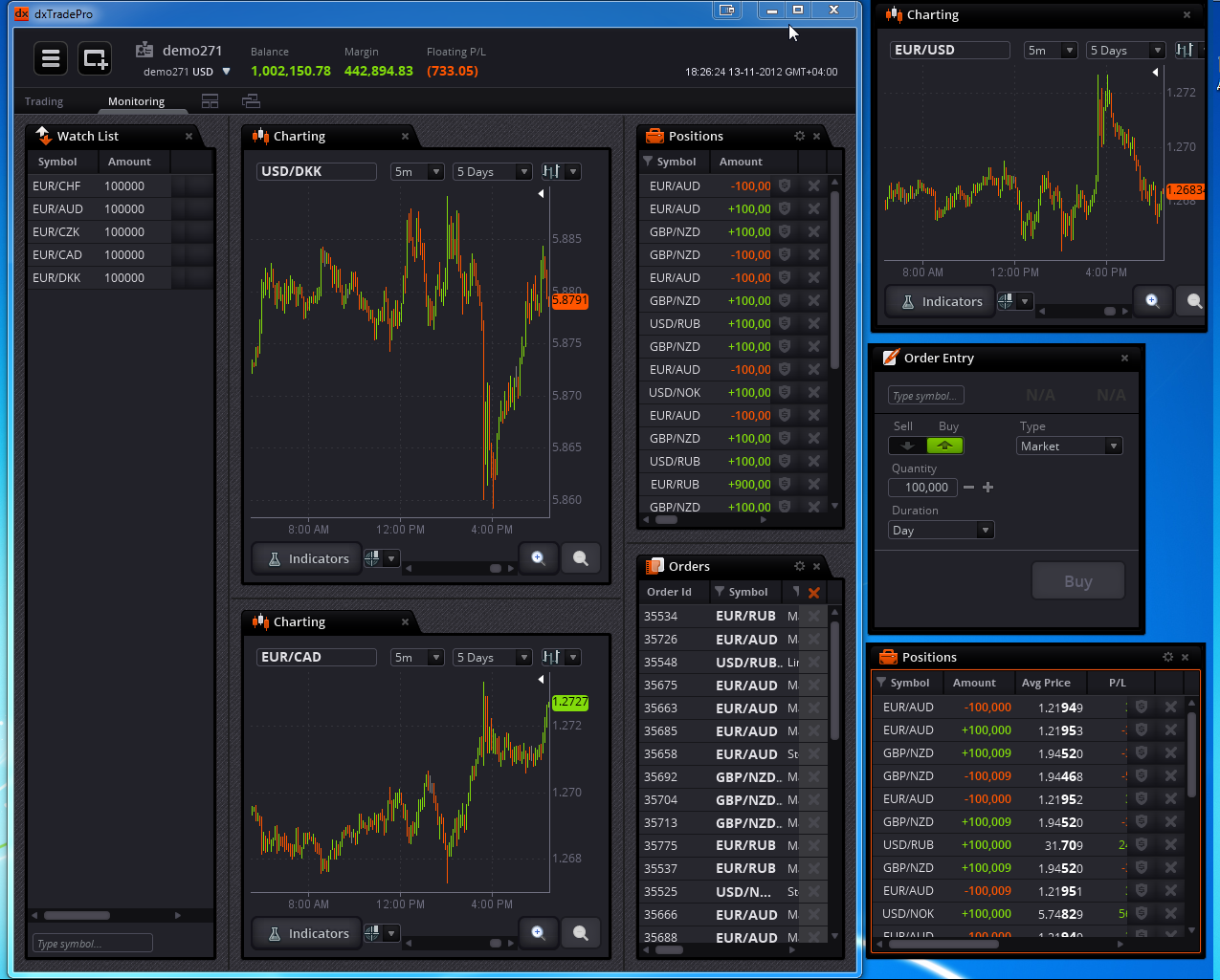 Since resizing and arranging components is a basic feature that users require from a desktop application, attention should be paid to this. Since the choice is often to remove the flaw of overlap, frameworks like the one used in editions of dxTradePro allow automatic ‘docking’ and splitting of the workspace to fit components. Presto! No more overlaps.